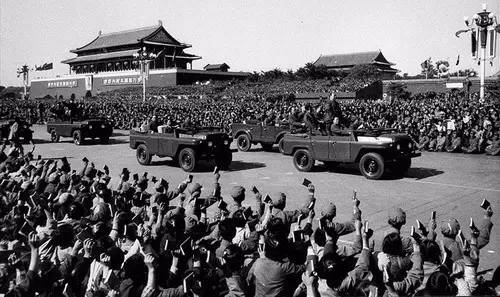 ▍1966 年 10 月,毛泽东乘坐国产北京 212 吉普检阅红卫兵
